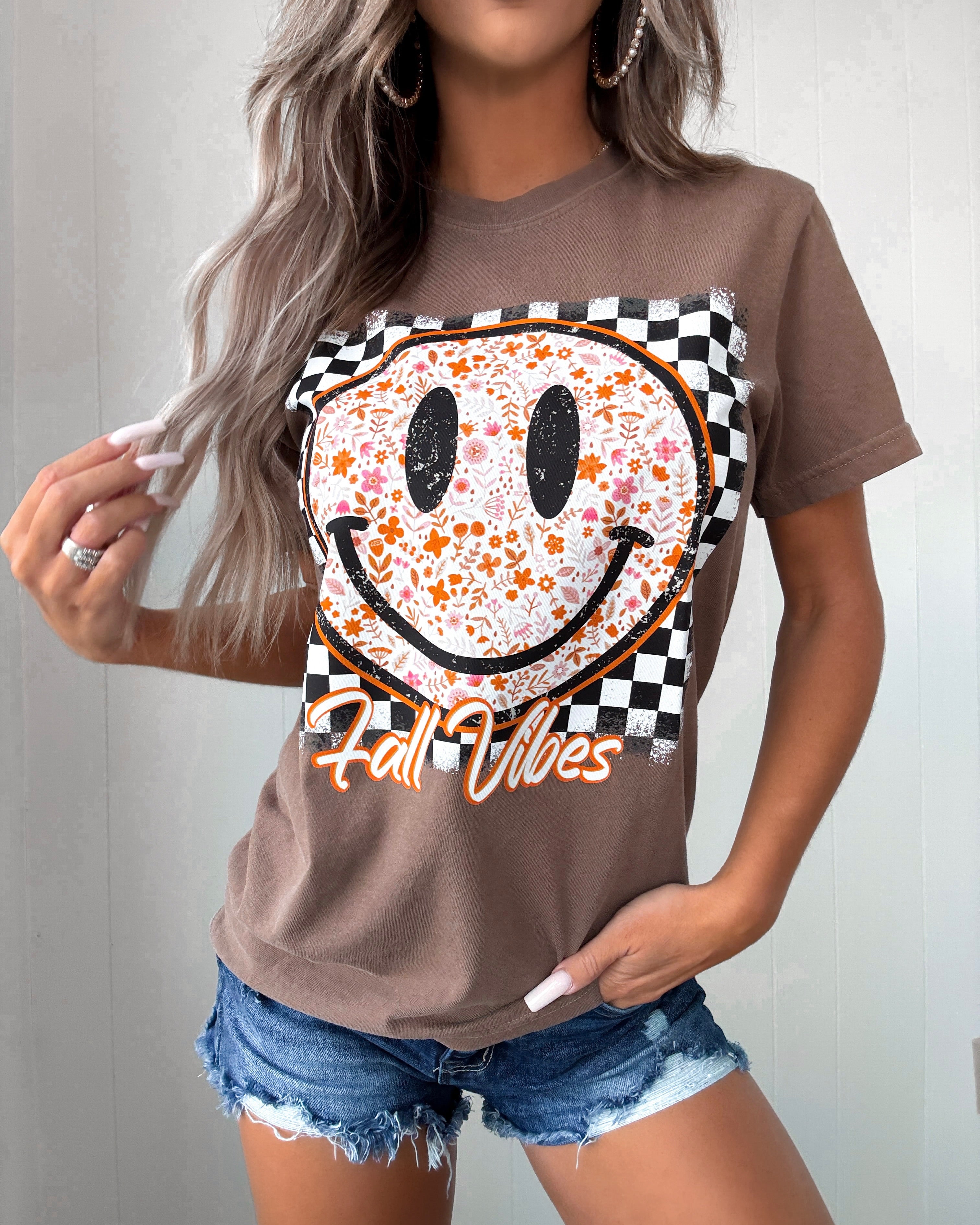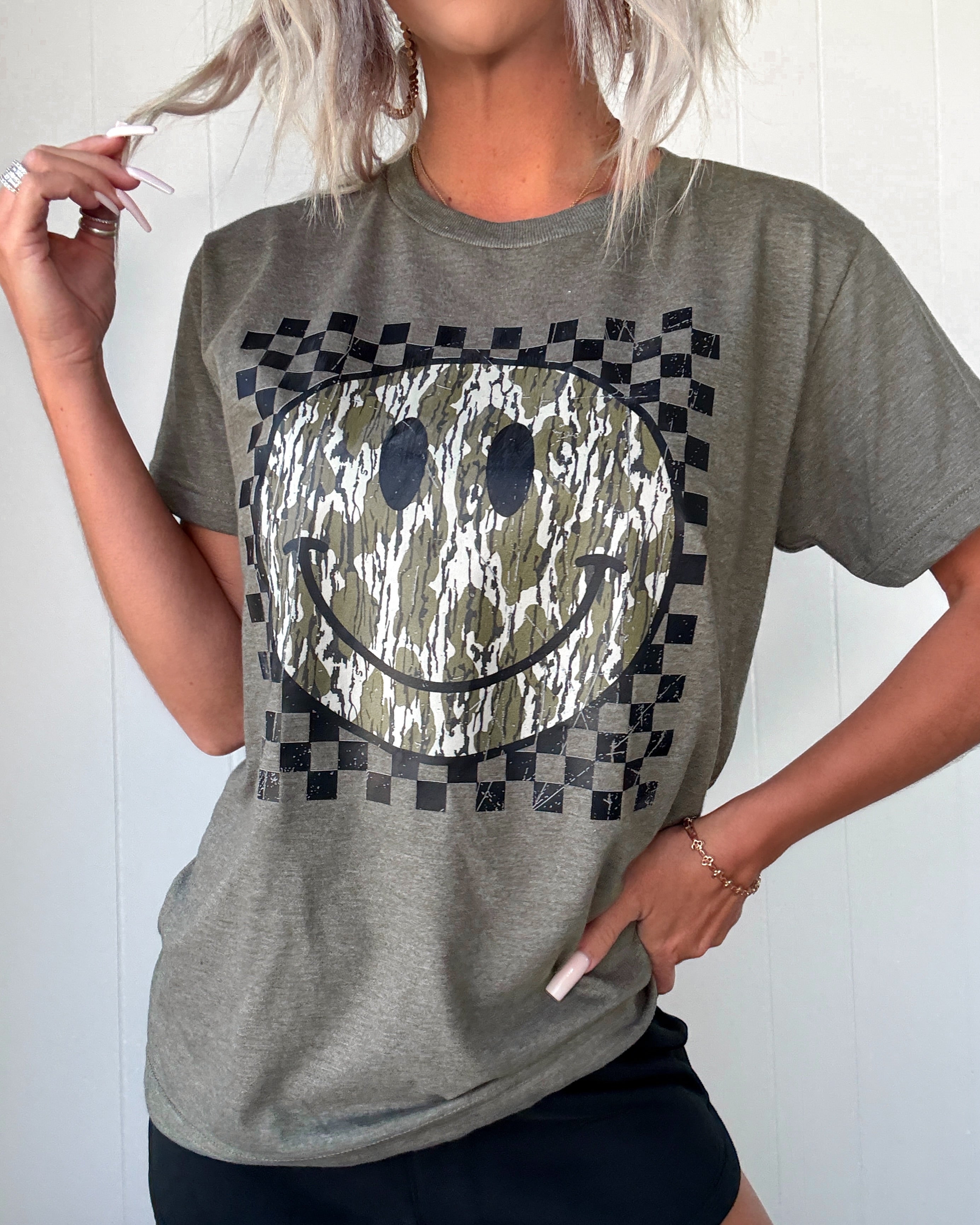 Checkered Camo Smiley Face Graphic Tee - Olive