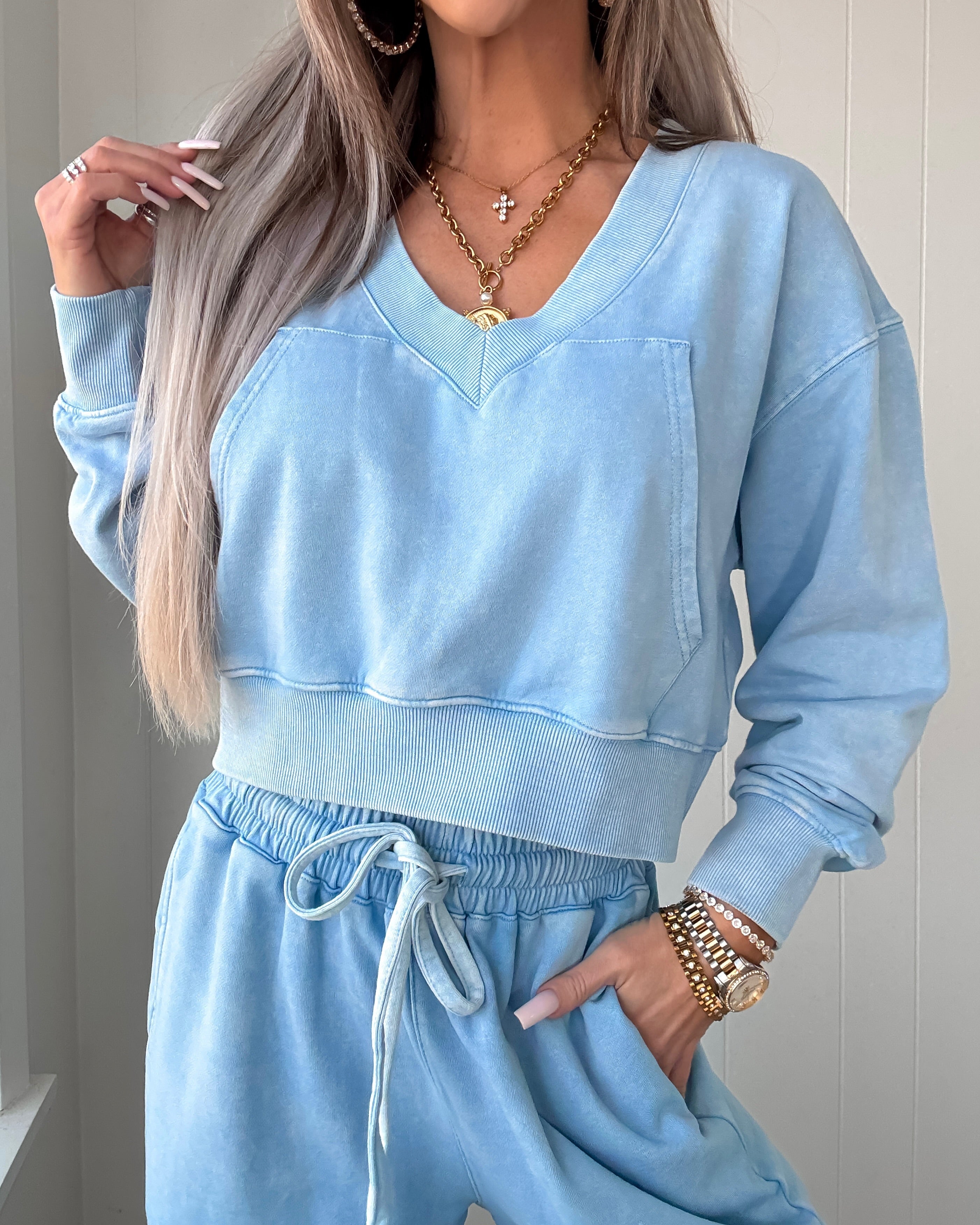 The Harper Lounge Crop Sweater - Washed Sky Blue