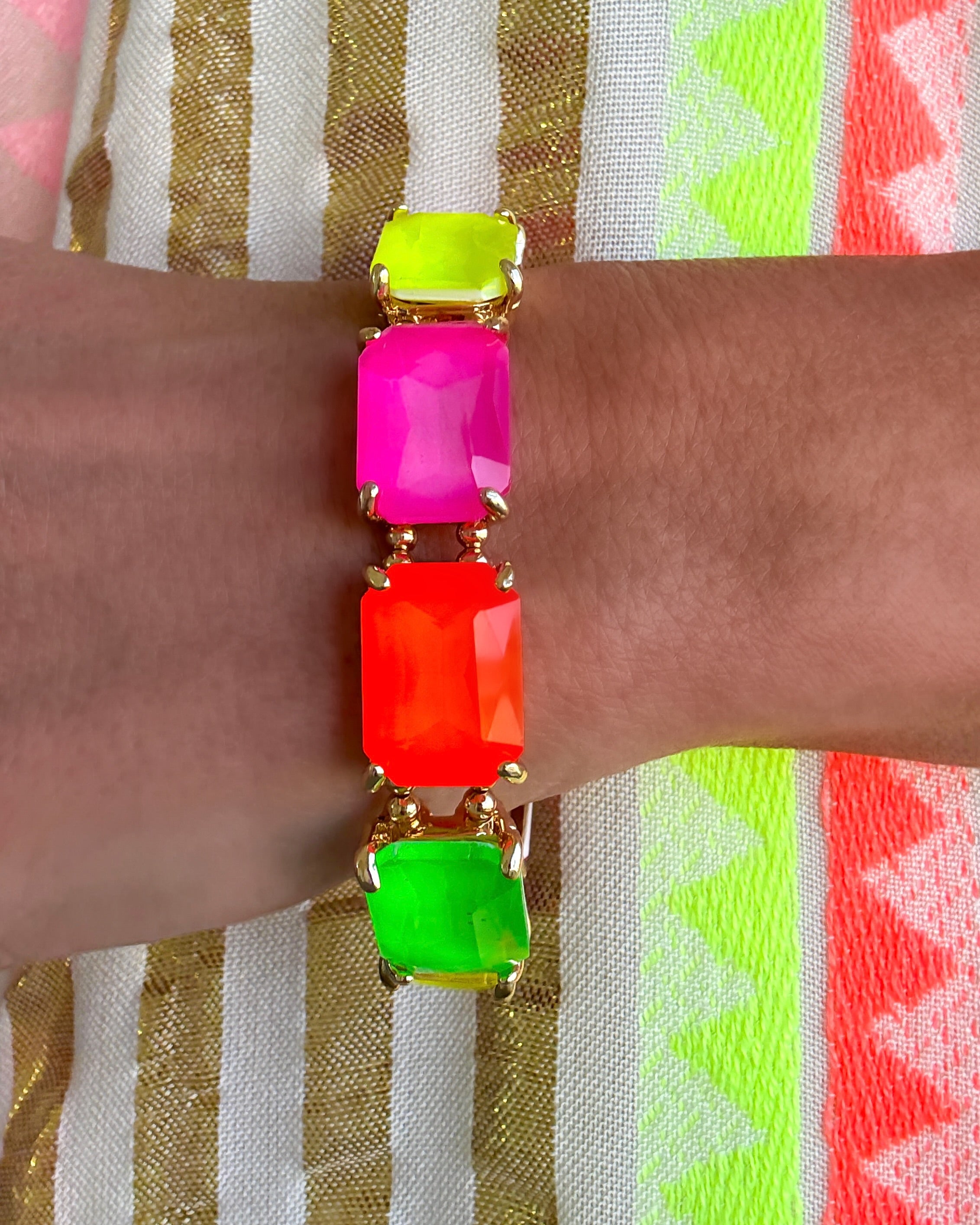 Rectangular Glass Crystal Link Stretch Bracelet - Neon Multi