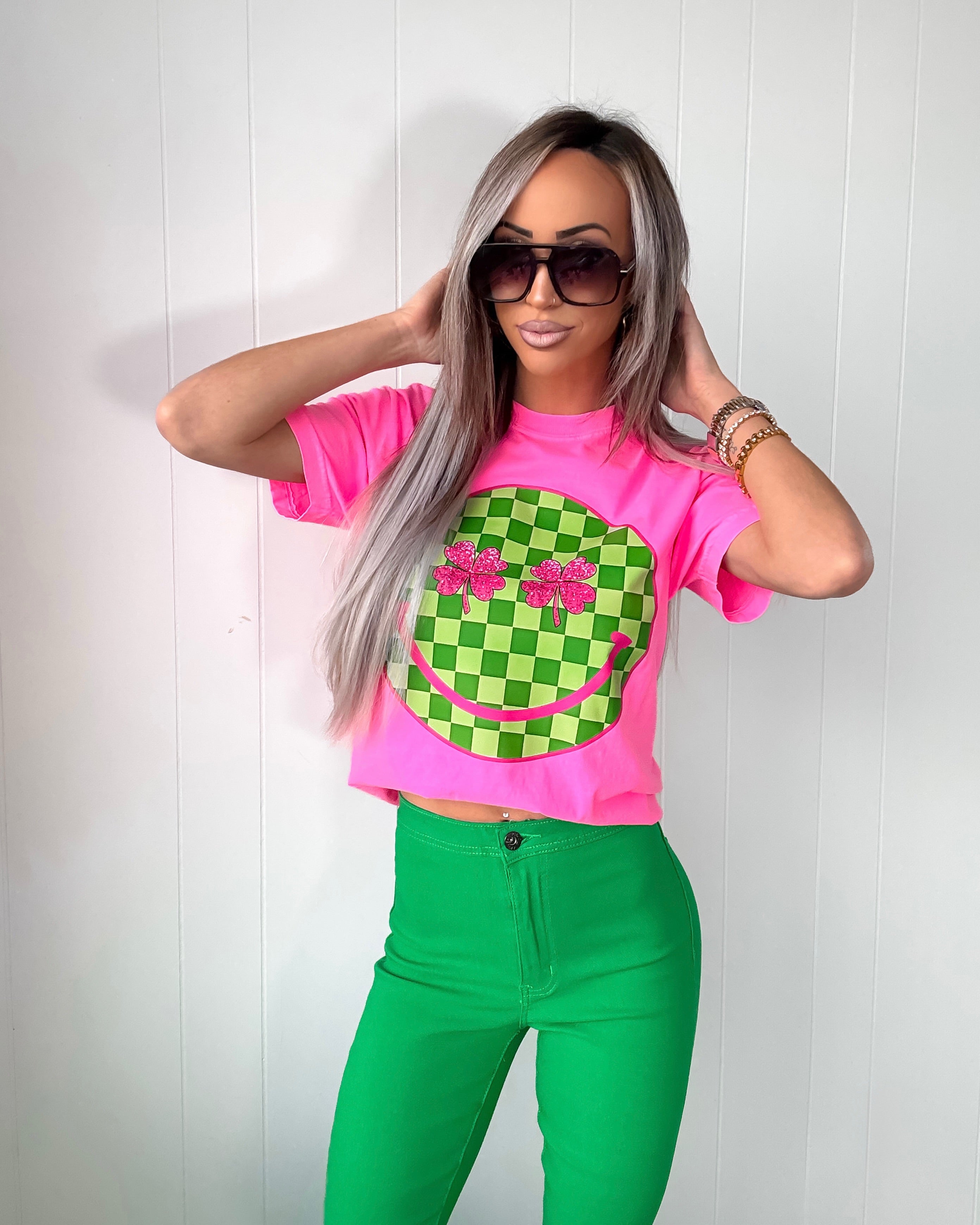 Checkered Camo Smiley Face Graphic Tee - Olive